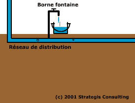 d'eau en béton armé), Réseau de distribution (tuyau PVC), Bornes fontaines
